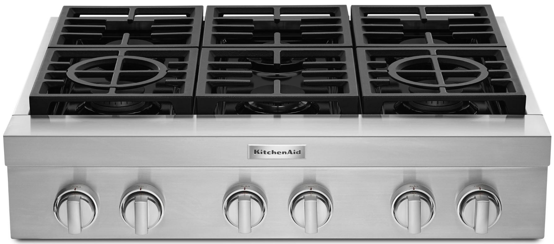 Expand your skills with a 36-inch KitchenAid® Commercial Style Rangetop with 6 burners. This gas cooktop offers power and precision to successfully sear, simmer, stir-fry and sauté. It features two 20,000 BTU Ultra Power™ Dual-Flame Burners for high- and low-heat cooking, a 5,000 BTU Simmer & Melt Burner perfect for small saucepans and three 15,000 BTU burners.Read More
