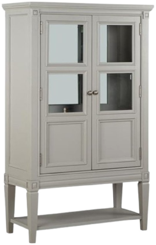 The Glenbrook cabinet finished in a soft pebble tone over birch veneer and hardwood solids. It features two wood-framed glass doors, adjustable glass shelf, led lighting, and a single tinted dovetail drawer with wire management and tempered mirror backing.Read More